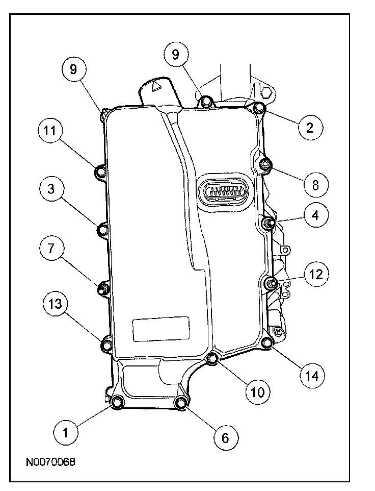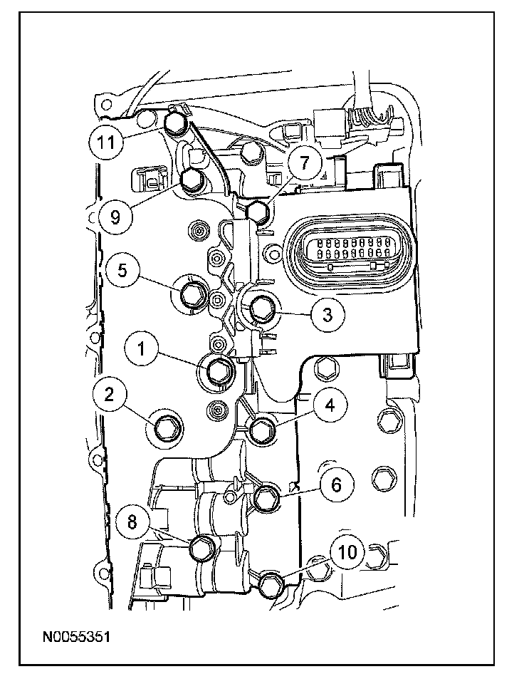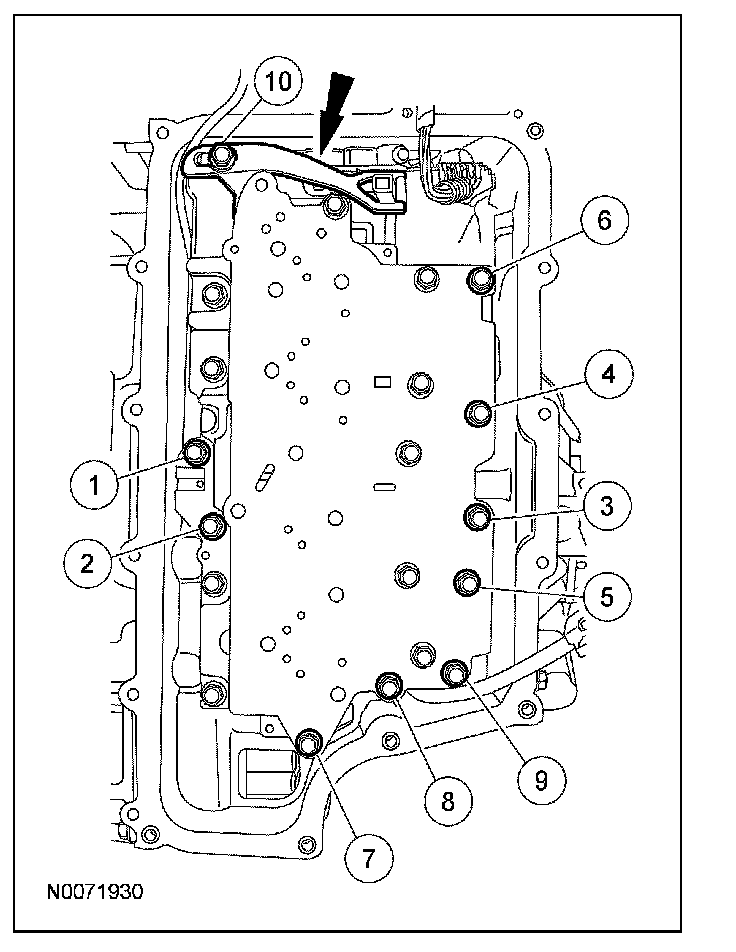 3. Install the TR sensor detent spring and the 10 bolts. Tighten the bolts in the sequence shown.