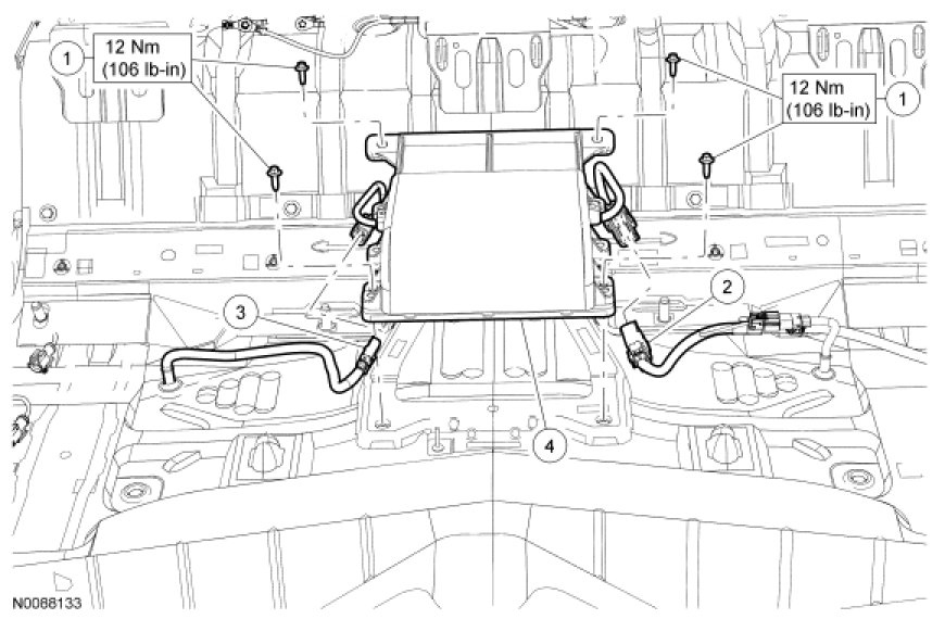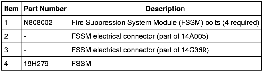 3. WARNING: The tightening torque of the fire suppression system module (FSSM) bolts and the FSSM orientation on the body of the vehicle is critical for correct system operation. Always tighten and orient the FSSM per specifications. Failure to do so may result in incorrect fire suppression system operation, which increases the risk that it will not protect vehicle occupant(s).