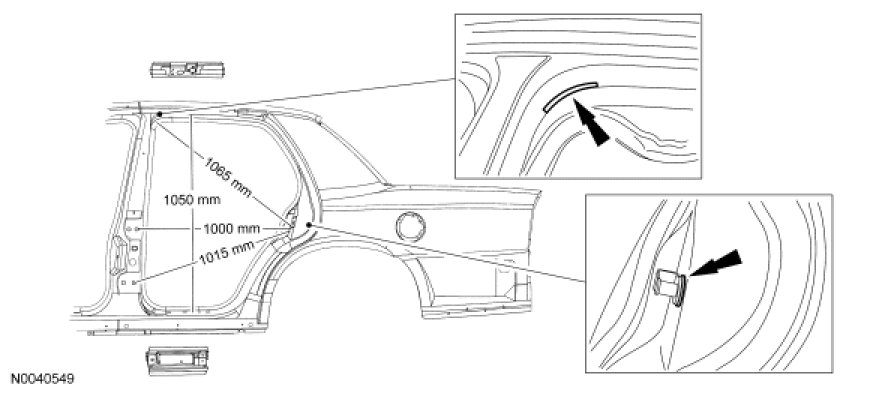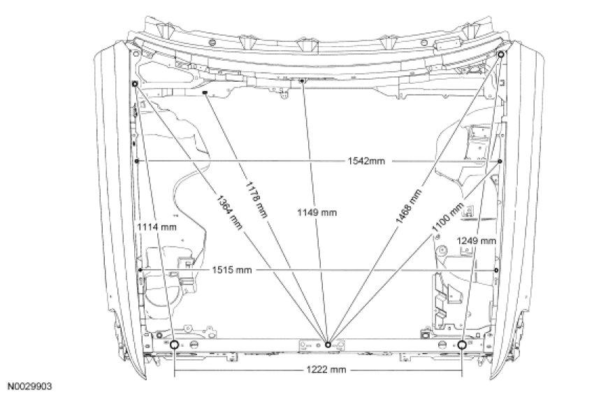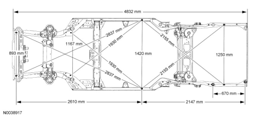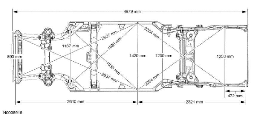 NOTE: All vehicle frames contain welded steel reinforcements, located in the rear frame rails near the control arm area. A welded steel insert is also contained in the front torque box area located at the A1 and A2 master locator holes. Care must be exercised when attempting to restore the vehicle to pre-accident dimensions, particularly if heat is applied when carrying out repairs to these areas. Vehicles with fire suppression systems have additional reinforcements located in the rear side members.