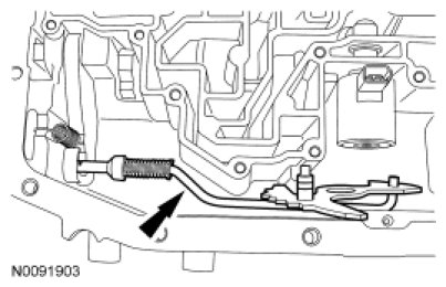 15. Remove the manual control lever valve detent lever and the parking lever actuating rod assembly.
