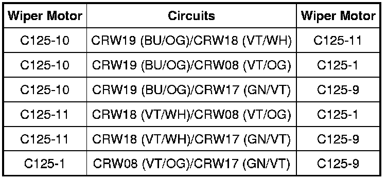 - Measure the resistance between wiper motor C125, harness side, using the following chart: