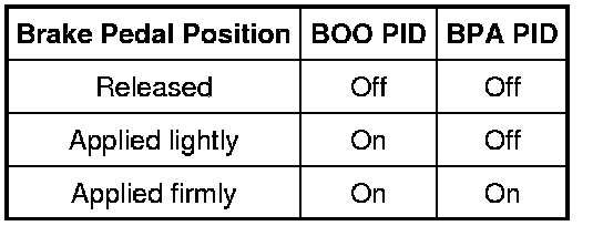 - Monitor the PCM PIDs BOO (brake pedal top travel) and BPA (brake pressure switch) while applying and releasing the brake pedal as follows: