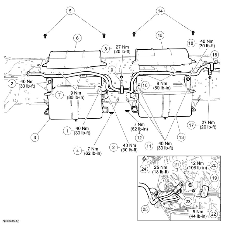 NOTE: The preferred method of service requires the use of a floor hoist to lift the vehicle overhead, and a transmission jack to support and lower the frame-mounted battery case.