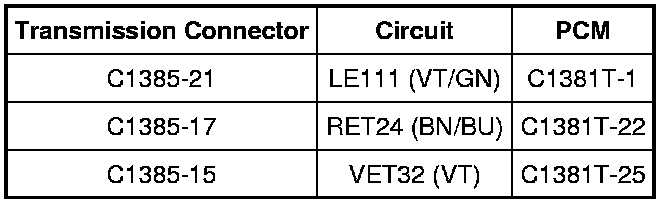 - Measure the resistance between transmission vehicle harness C1385 and PCM C1381T using the following chart.