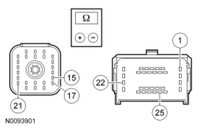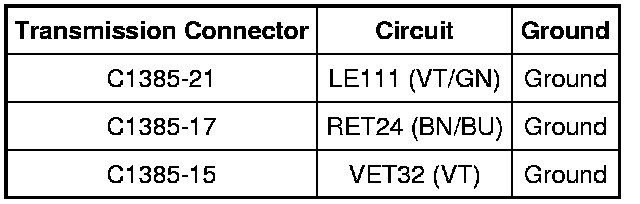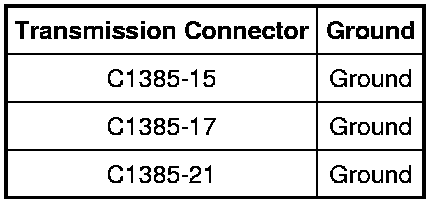 - Measure the resistance between transmission vehicle harness C1385 and ground using the following chart.