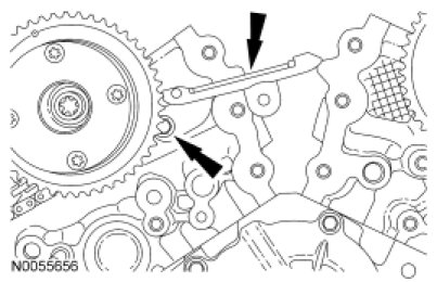5. Rotate the crankshaft clockwise and align the timing marks on the Variable Camshaft Timing (VCT) assemblies as shown.