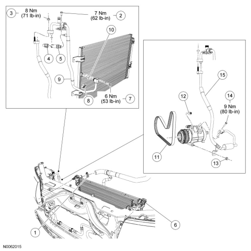 12. Detach the compressor-to-condenser discharge line-to-radiator clip.