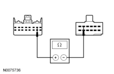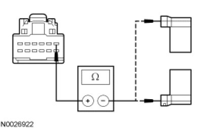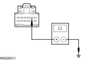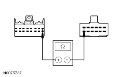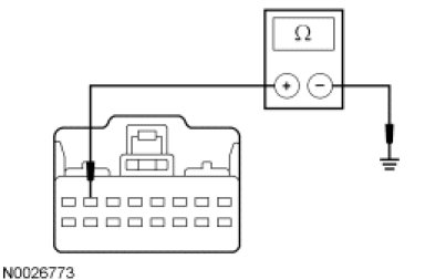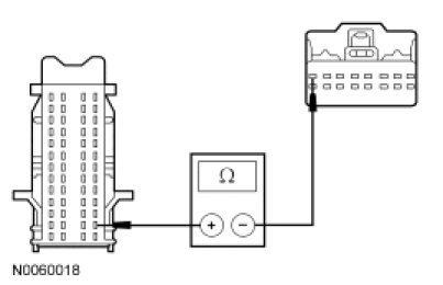 - Measure the resistance between the SJB C2280e-5, circuit CRH04 (VT/GN), harness side and the horn C131-2, circuit CRH04 (VT/GN), harness side.