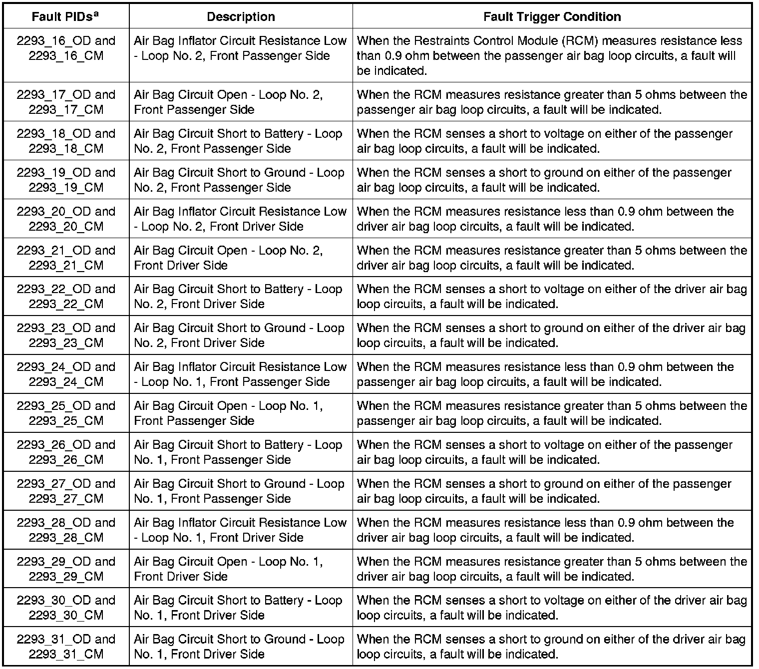 The Restraints Control Module (RCM) continuously monitors driver/passenger air bag loop 1 and 2 circuits for the following faults: