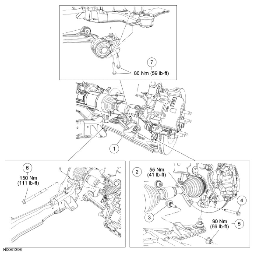 6. With the weight of the vehicle resting on the wheels and tires, tighten the lower arm-to-frame forward bolts to 150 Nm (111 lb-ft).