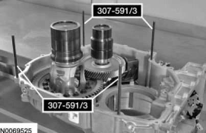 35. Remove the Differential/Transfer Gear Bearing Shim Gauge 307-591/1 and 307-591/2 from the differential and transfer shaft assemblies.