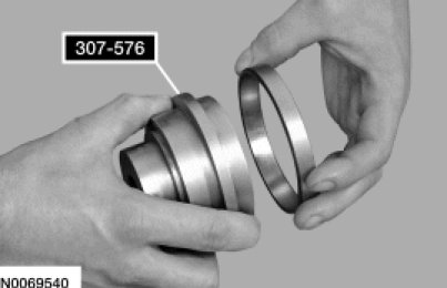 48. Using the Bearing Cup Installer 307-576, Transfer Gear Bearing Installer 307-541 and the Drawbar 204-029, press the differential bearing cup in the torque converter housing.