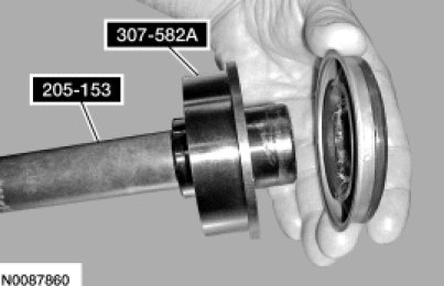 59. Assemble the Handle 205-153 and the Cover Axle Seal Installer 307-582A, install a new halfshaft seal on Cover Axle Seal Installer 307-582A.