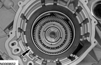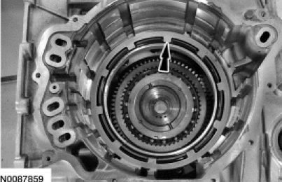 88. NOTICE: Failure to align the tab on the bottom of the low/reverse pressure plate with the gap in the low One-Way Clutch (OWC) snap ring may result in damage to the transaxle.