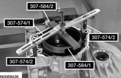 Install the Forward Clutch Spring Compressor 307-574 (307-574/1 and 307-574/2) and the 2-6 Spring Compressor 307-584 (307-584/1 and 307-584/2) and compress the forward clutch piston return spring.