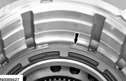 73. Compare the position of the low OWC snap ring gap with the tab on the low/reverse clutch pressure plate to be sure that the gap is in the right position.