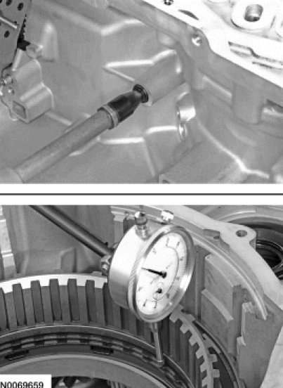 76. Apply 483 kPa (70 psi) of air pressure to the forward clutch piston port while recording the clutch pack clearance on the Dial Indicator. The clearance should be between 0.85 mm (0.033 in) and 2.41 mm (0.095 in). If the clearance is out of range, check the forward clutch pack and low OWC for correct installation. If the forward clutch pack and low OWC is correctly installed, install a new forward clutch pack.