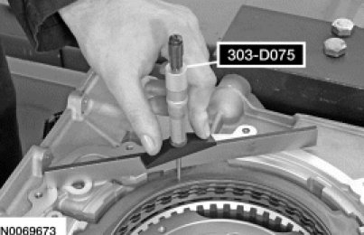 100 Using a suitable straightedge and the Depth Micrometer 303-D075, measure and record as measurement A, the distance from the transaxle case deck surface to a low point on the intermediate clutch wave spring.