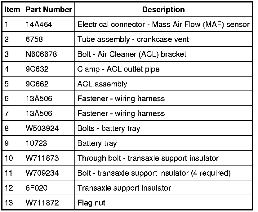 8. Disconnect the Mass Air Flow (MAF) sensor electrical connector and the wiring harness fastener from the Air Cleaner (ACL) assembly.