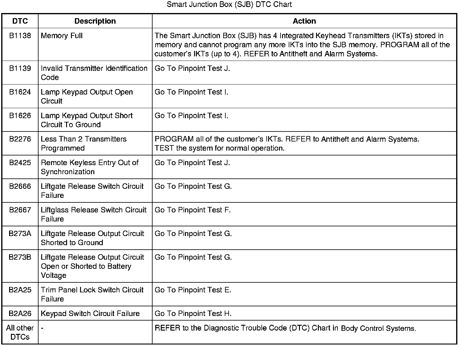 Smart Junction Box (SJB) DTC Chart