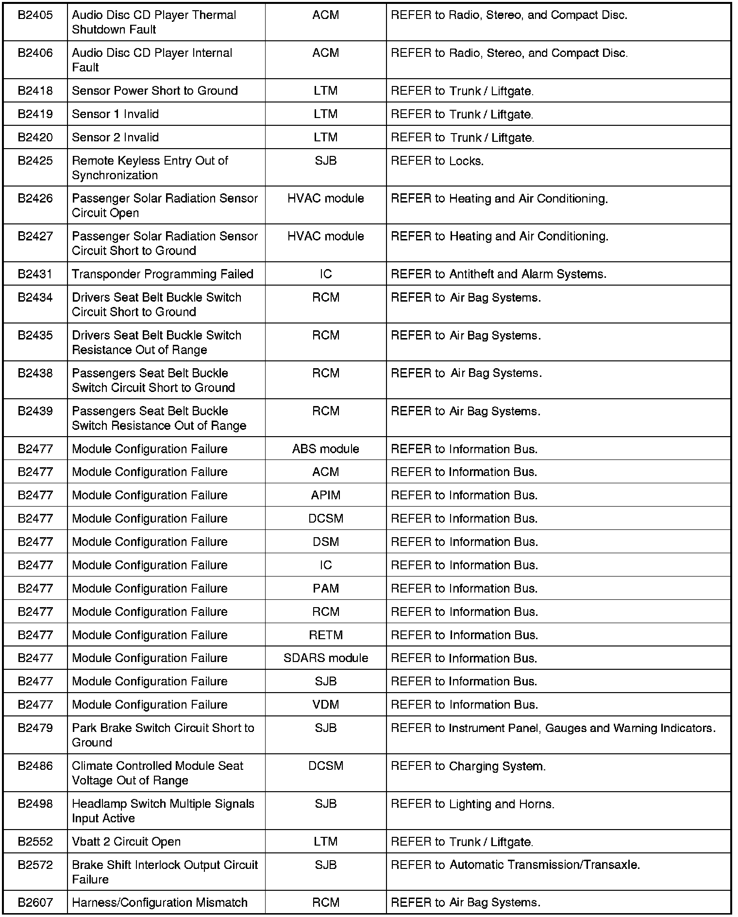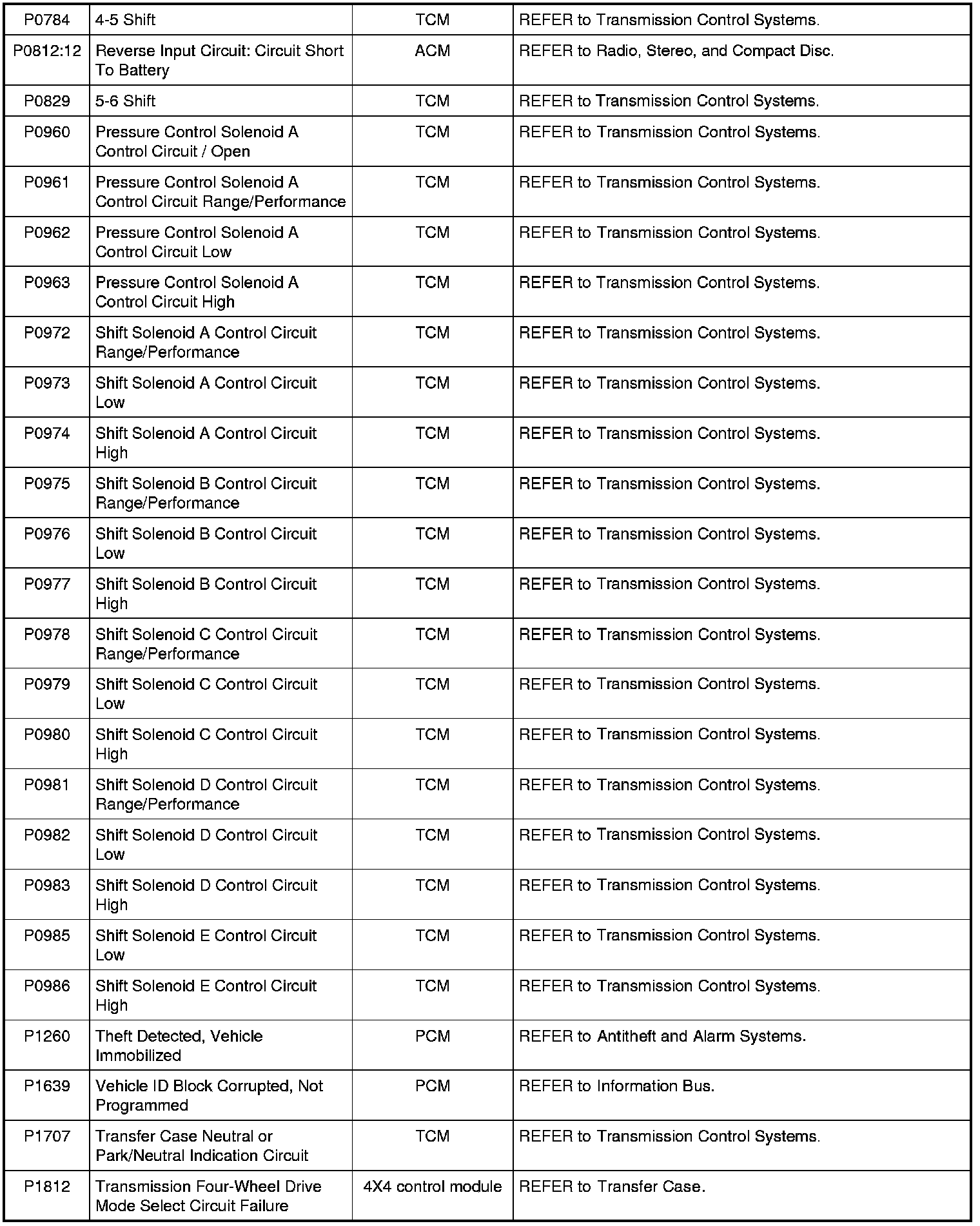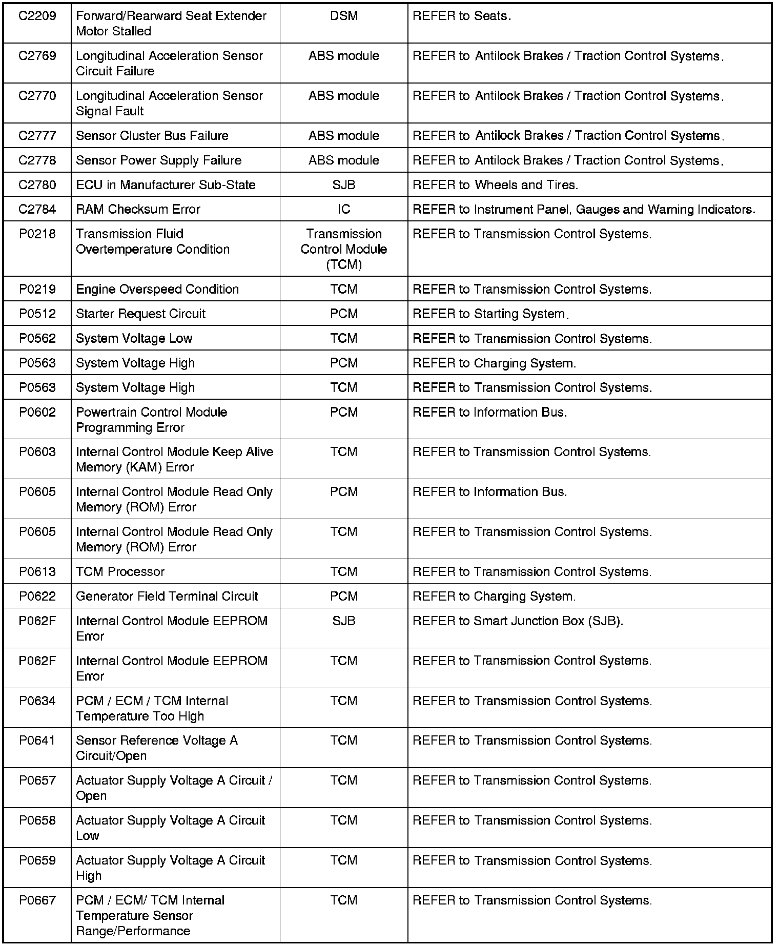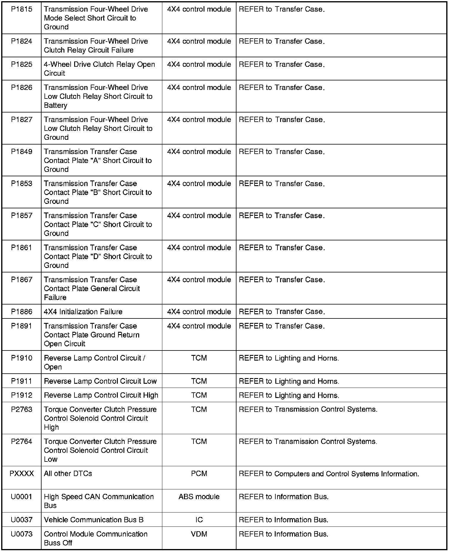 Diagnostic Trouble Code (DTC) ChartNOTE: Most powertrain (P-code) DTCs are diagnosed in Computers and Control Systems Information. If the P-code retrieved is not listed below, refer to Computers and Control Systems Information to continue diagnostics.