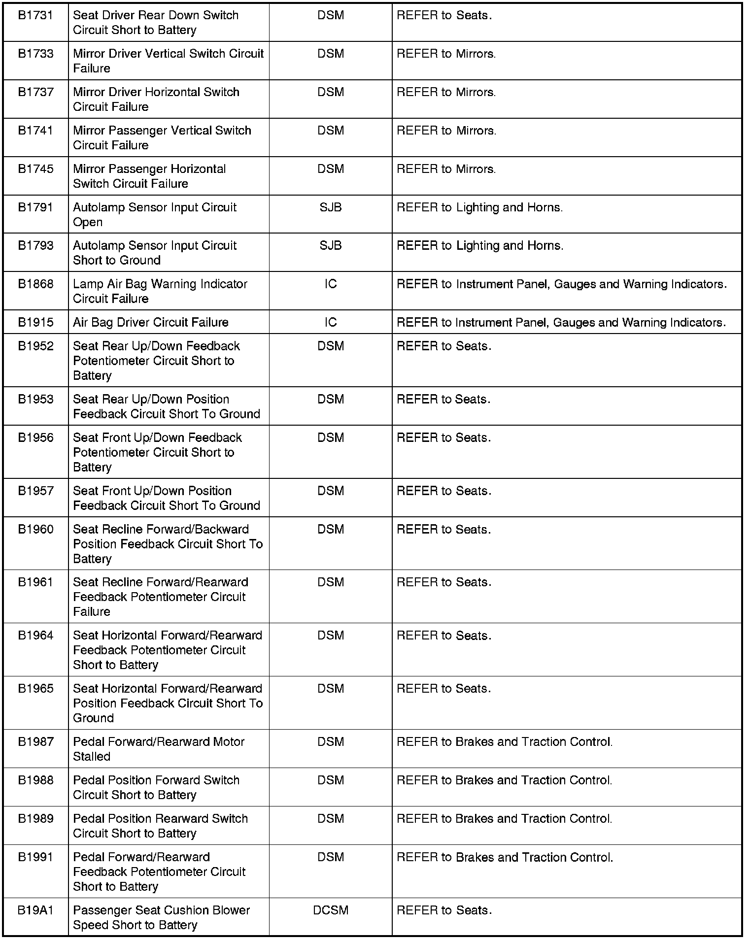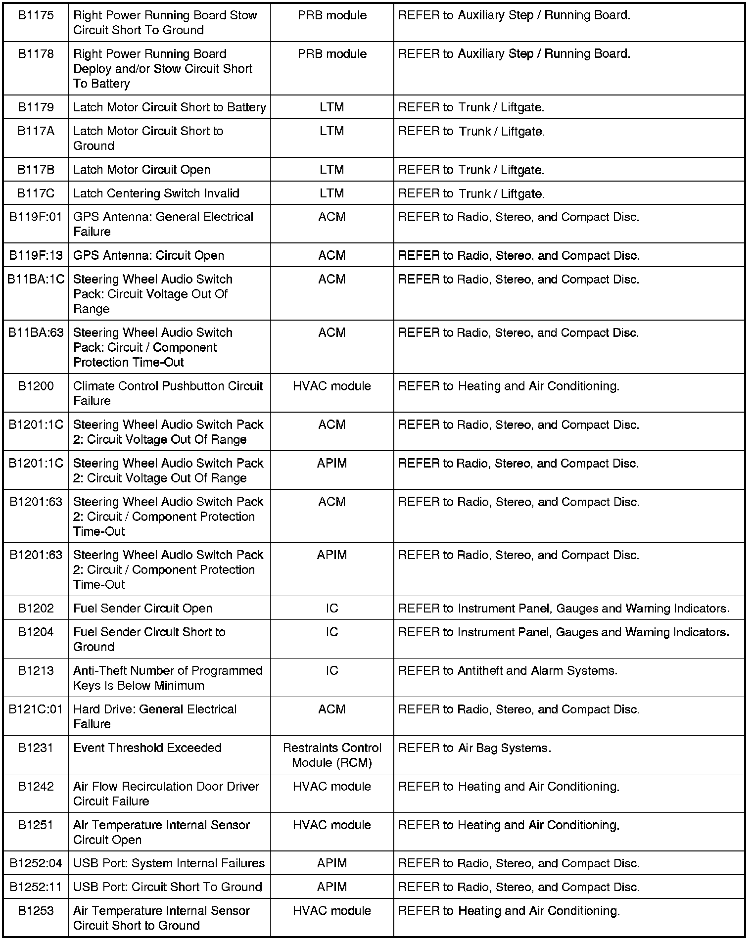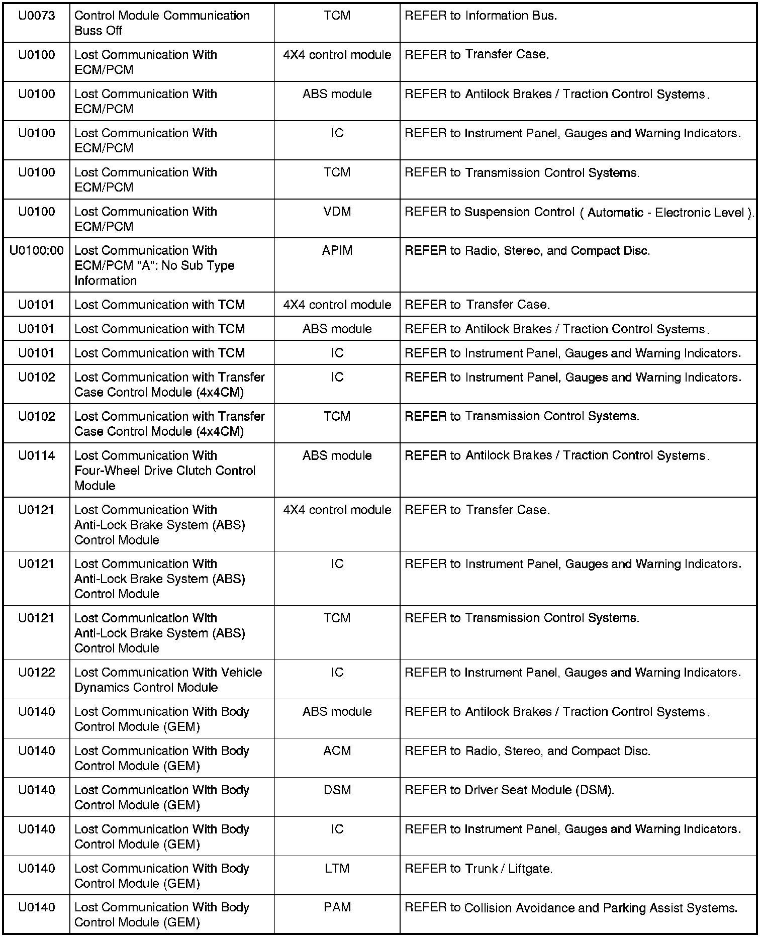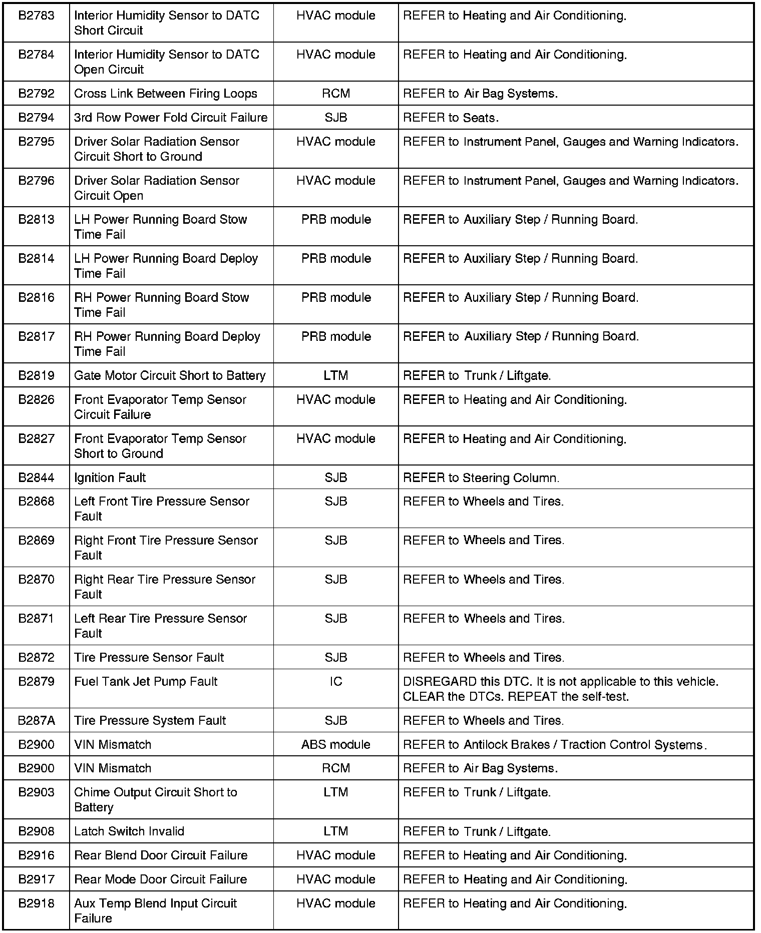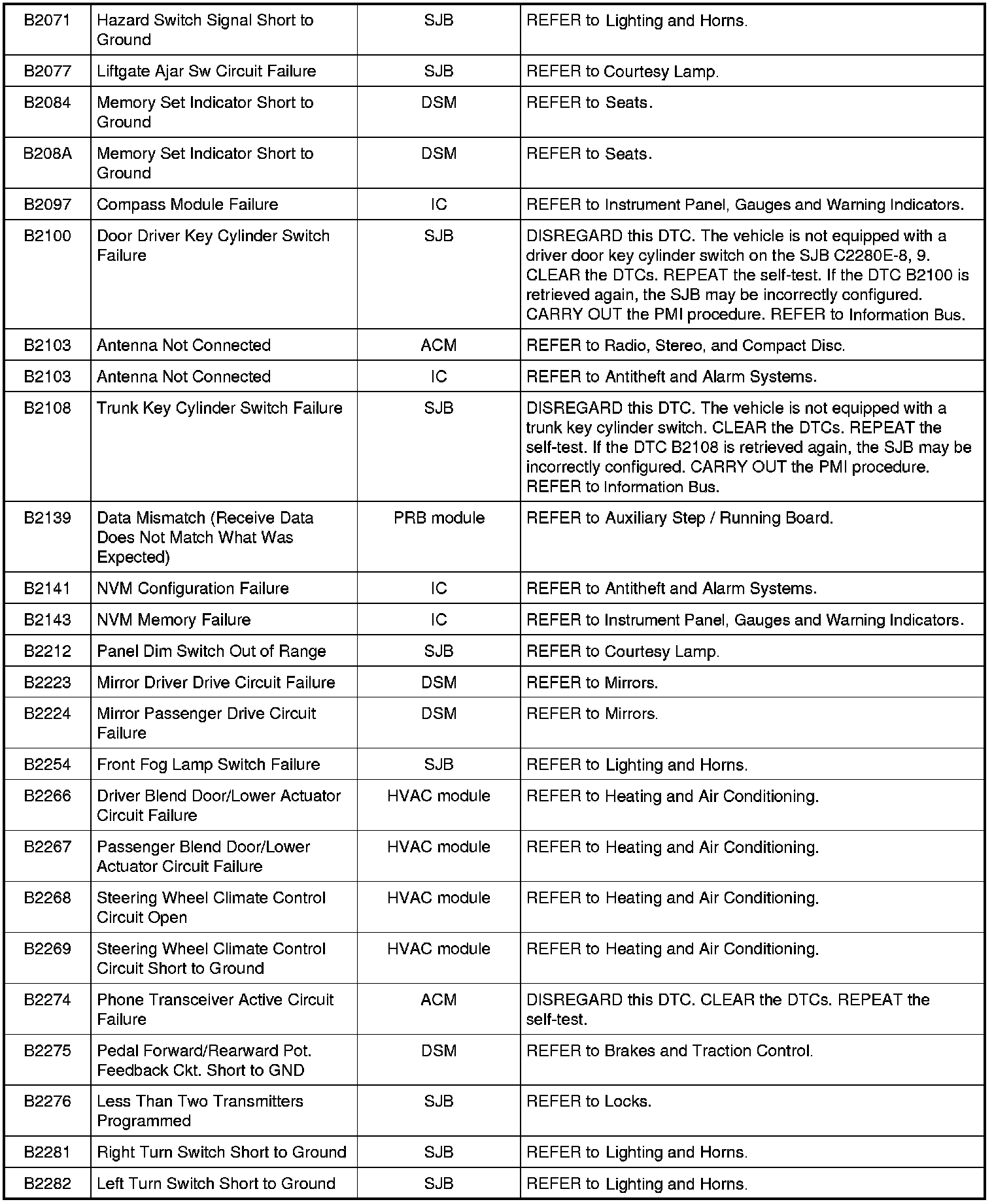 Diagnostic Trouble Code (DTC) ChartNOTE: Most powertrain (P-code) DTCs are diagnosed in Computers and Control Systems Information. If the P-code retrieved is not listed below, refer to Computers and Control Systems Information to continue diagnostics.
