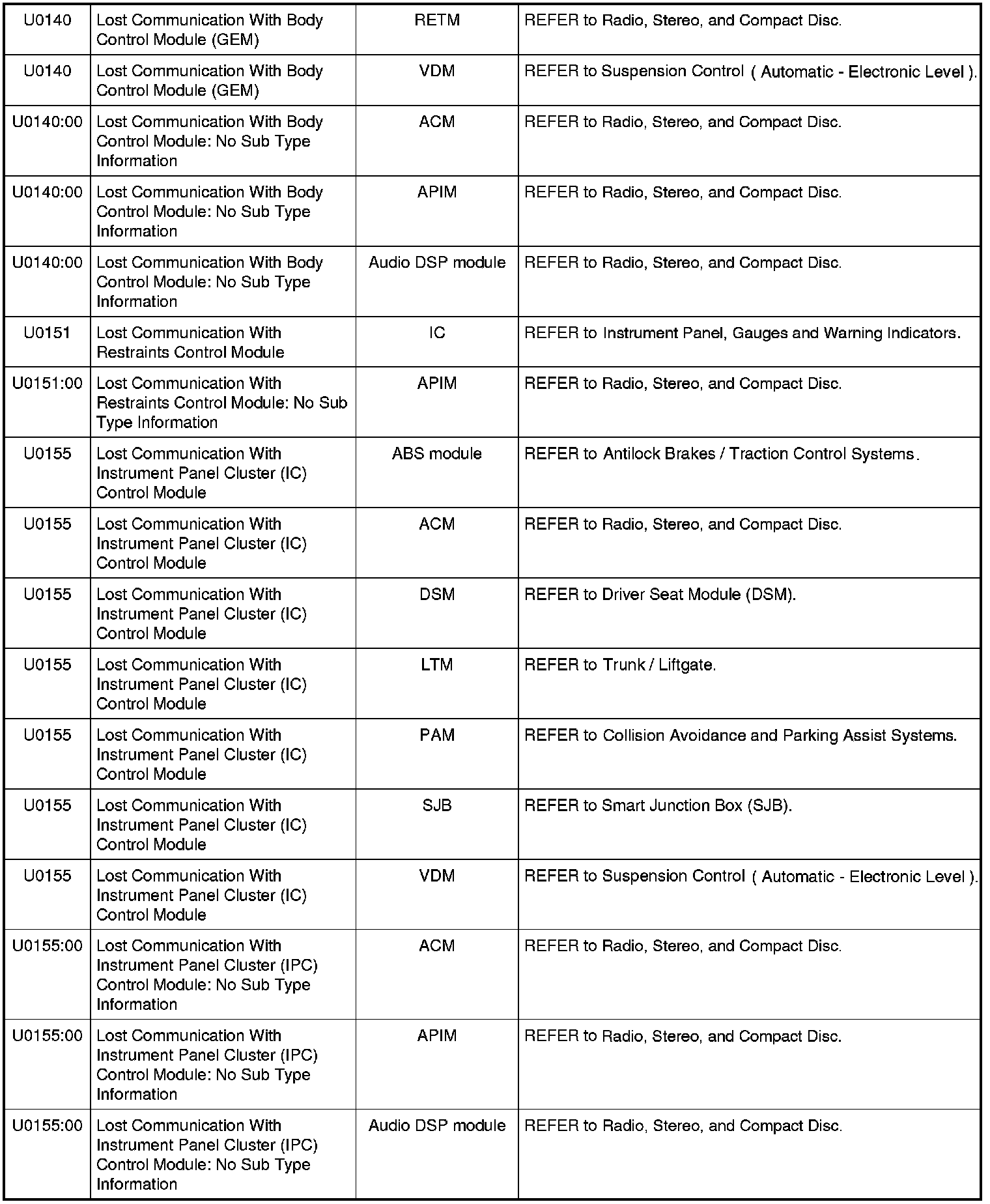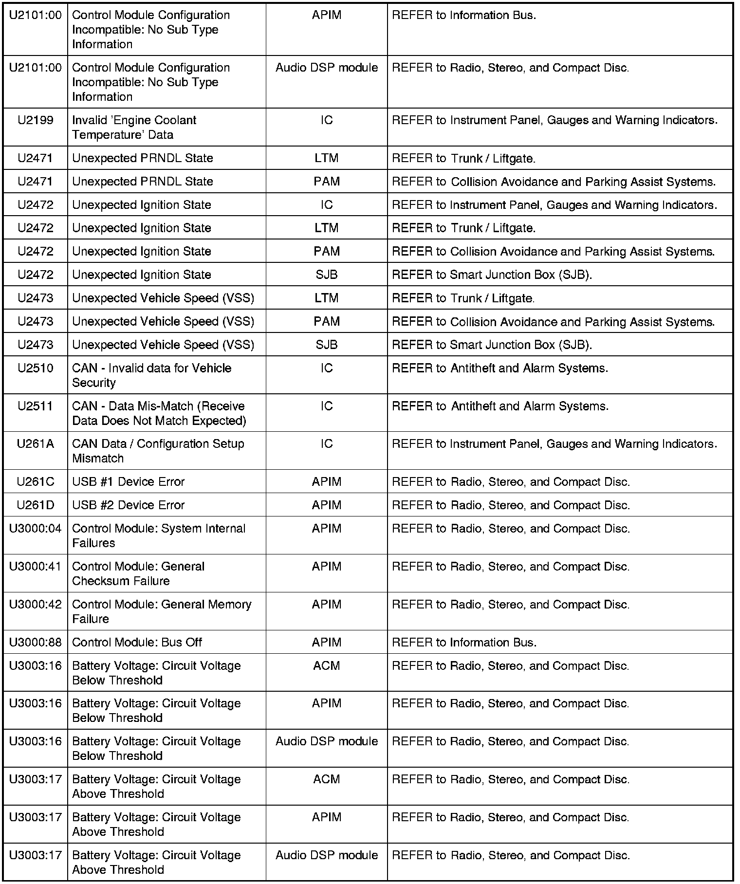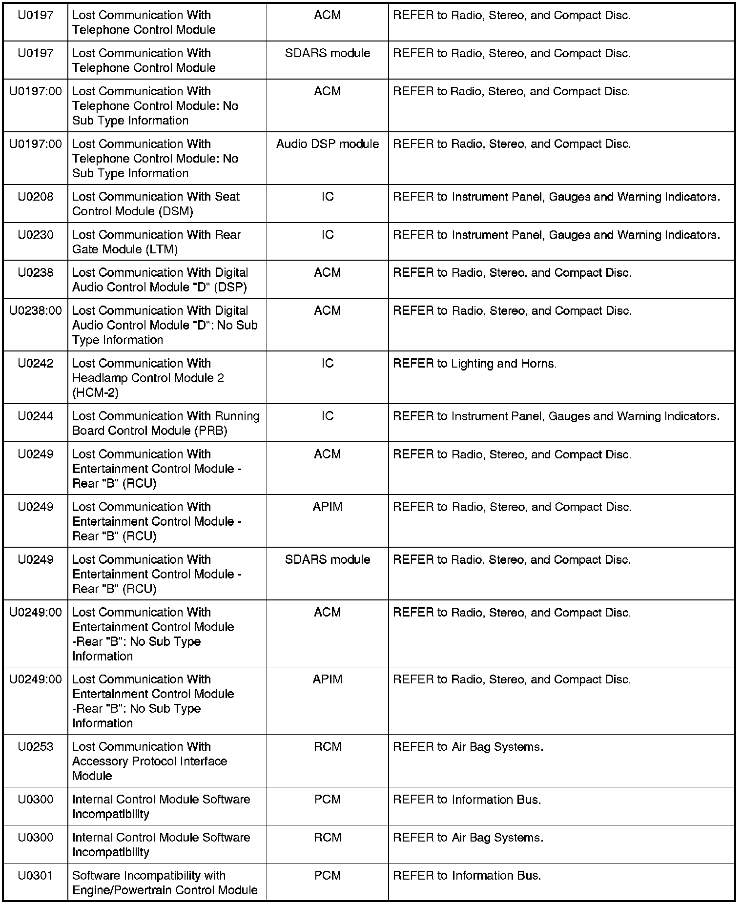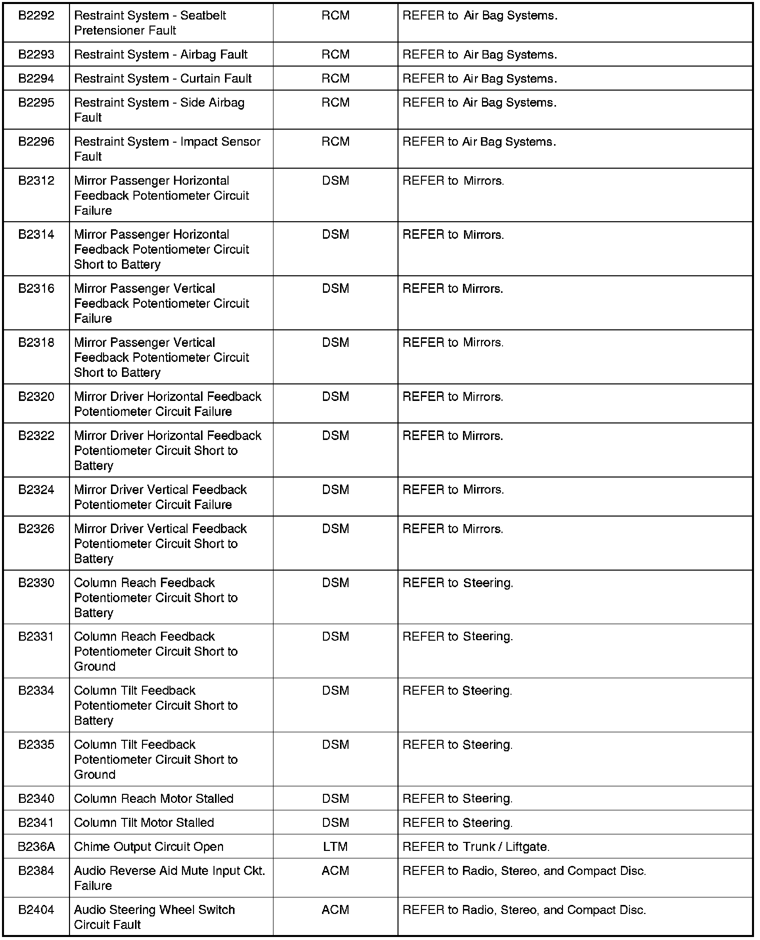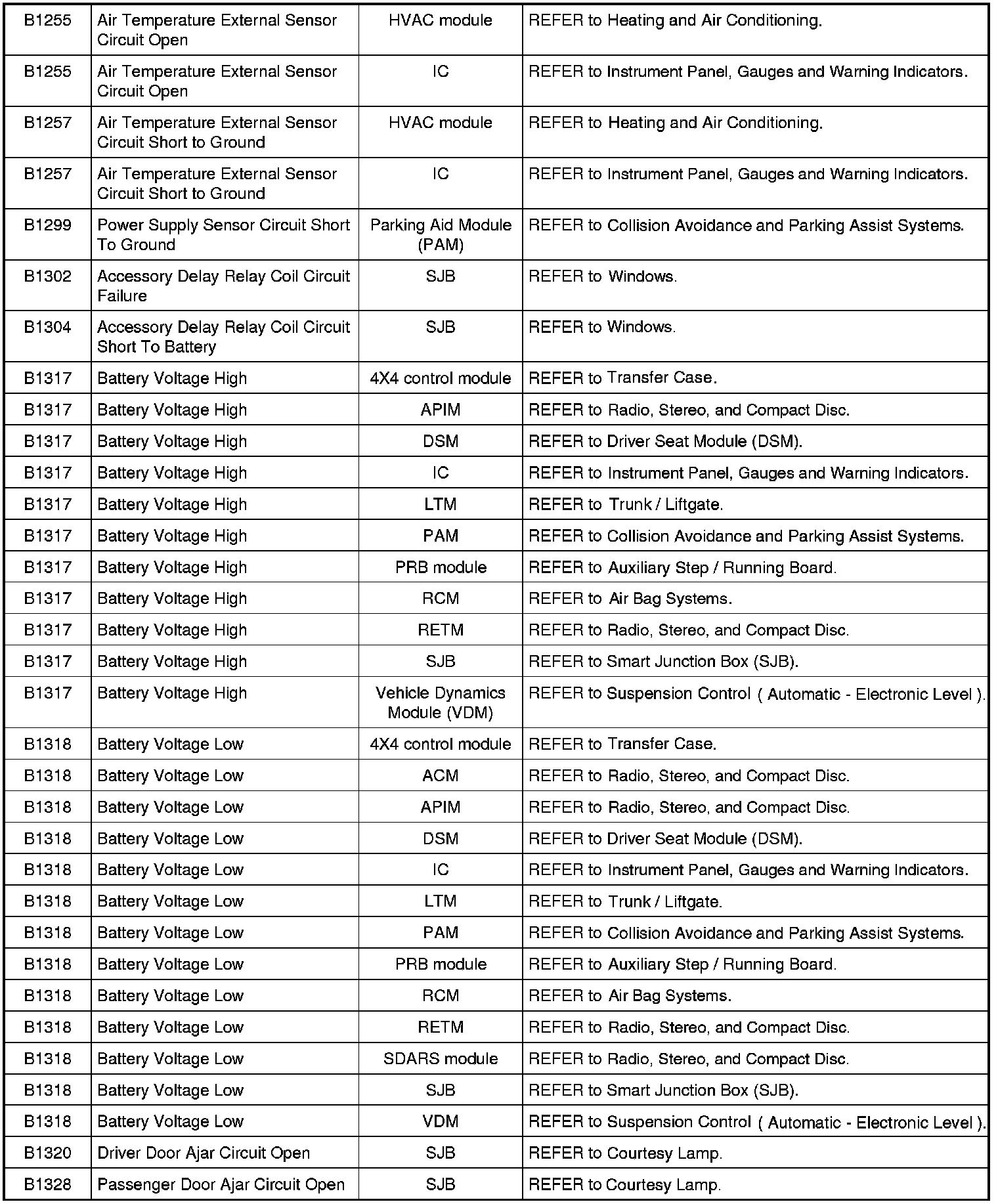 Diagnostic Trouble Code (DTC) ChartNOTE: Most powertrain (P-code) DTCs are diagnosed in Computers and Control Systems Information. If the P-code retrieved is not listed below, refer to Computers and Control Systems Information to continue diagnostics.