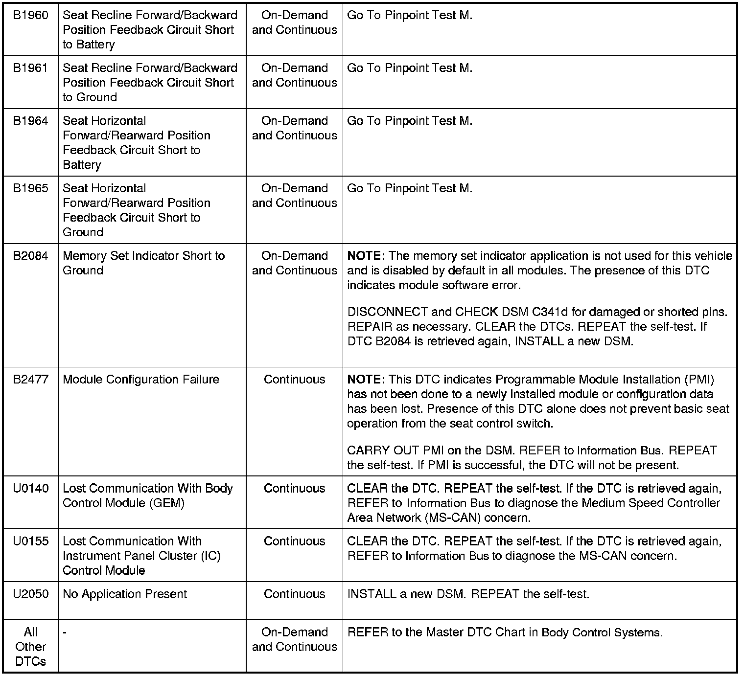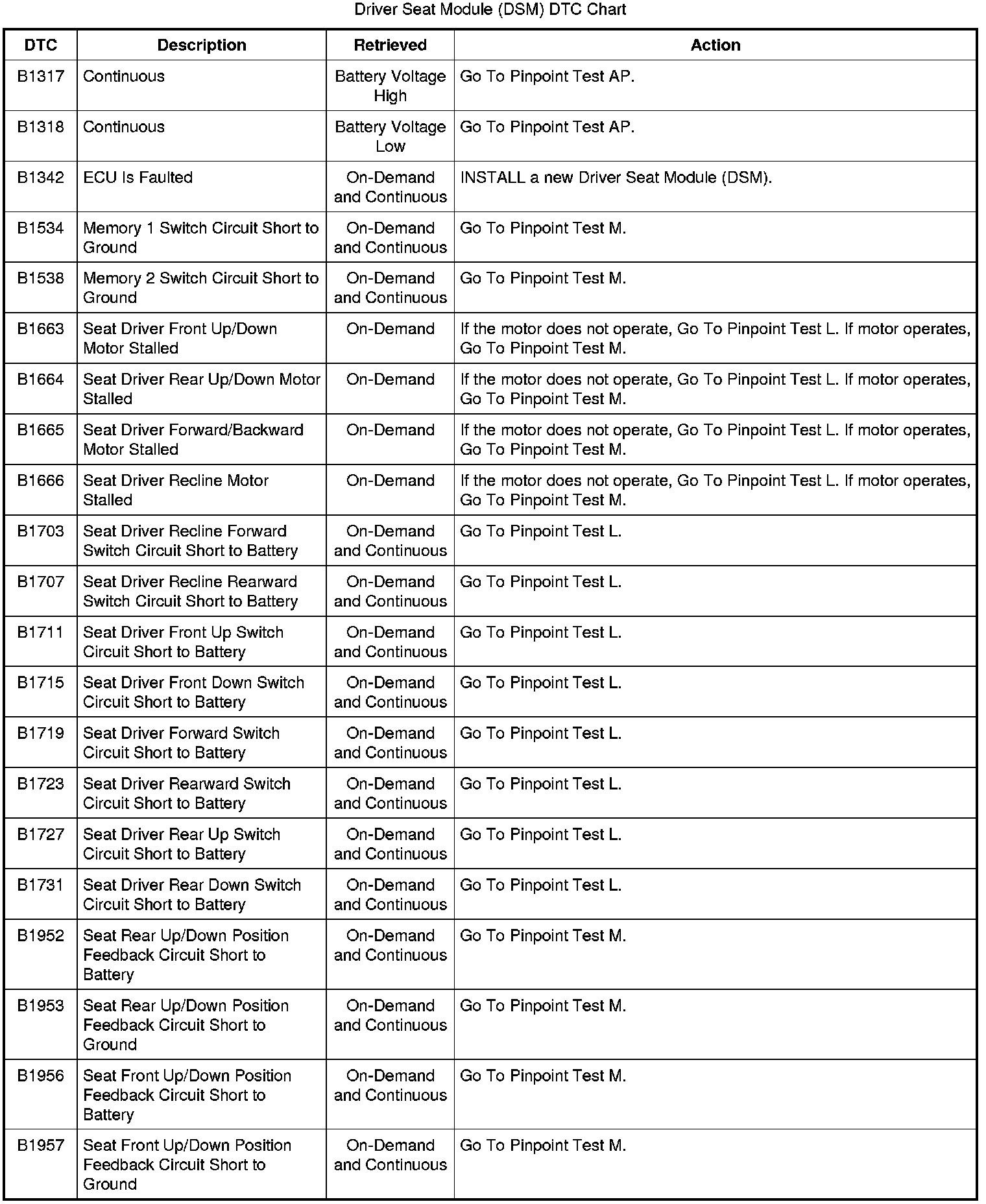 Driver Seat Module (DSM) DTC Chart