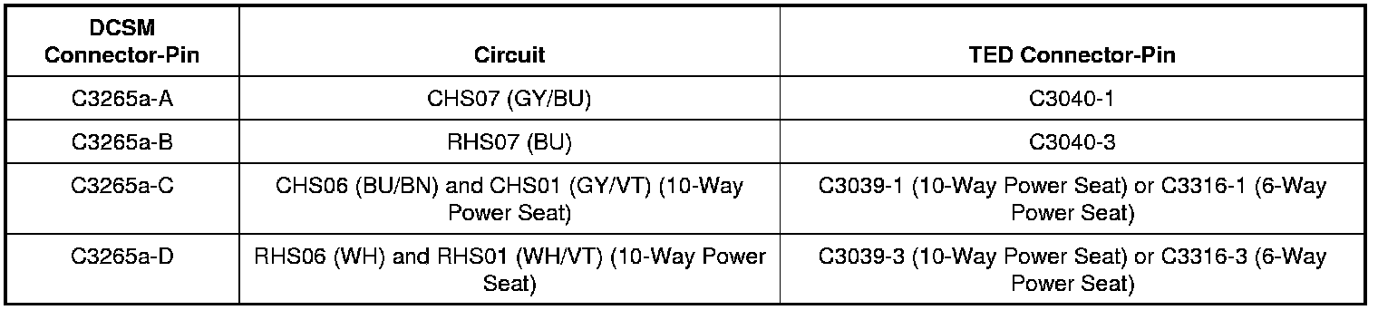 - backrest TED C3039 (10-way power seat) or C3316 (6-way power seat) pin 1 and pin 3, component side.