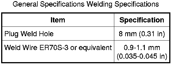 - Factory spot welds may be substituted with either STRW or MIG plug welds. Spot/plug welds should equal factory welds in both location and quantity. Do not place a new spot weld directly over an original weld location. Plug weld hole should equal 8 mm (0.31 in) diameter.