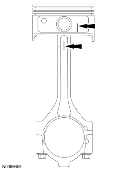 1. NOTE: The connecting rod must be installed into the piston with the marks made during disassembly on the same side. If a new piston or connecting rod is being installed, it can be installed in either direction.