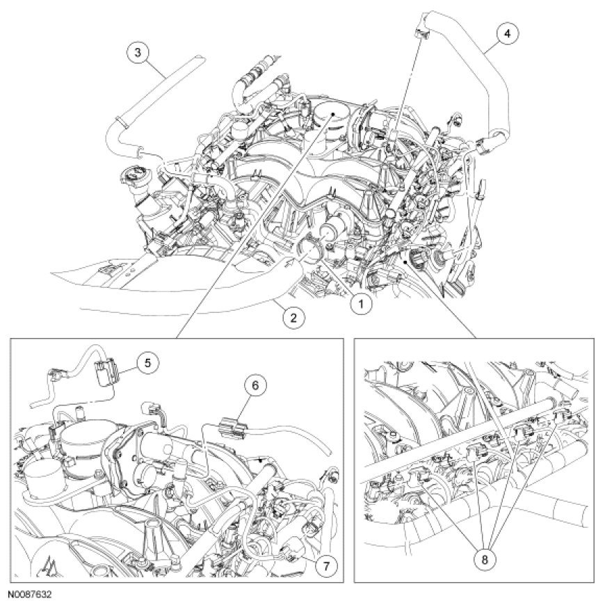 14. Disconnect the 4 LH ignition coil and the LH Variable Camshaft Timing (VCT) solenoid electrical connectors and detach the 2 engine wiring harness retainers from the LH valve cover studs.