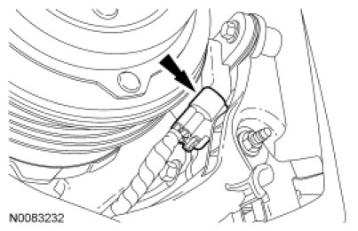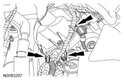 26. Connect the RH CMP sensor electrical connector and the 2 wiring harness retainers.