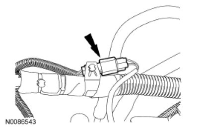 19. Connect the LH Camshaft Position (CMP) sensor, radio interference capacitor and Variable Camshaft Timing (VCT) solenoid electrical connectors, the radio interference capacitor electrical connector retainer and the 2 wiring harness retainers.