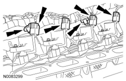 24. Connect the 4 RH ignition coil electrical connectors and the 2 engine wiring harness retainers to the RH valve cover studs.