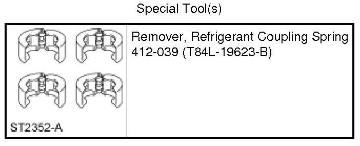 NOTE: If a leak has been found at a spring lock coupling, inspect the O-ring sealing surfaces on the male and female sides of the fitting for damage or scratches. Replace the affected component if damage is identified. If no damage is present, thoroughly clean both sides of the fitting using a suitable non-abrasive cloth, lubricate with PAG oil and install new O-ring seals. Due to subtle differences in O-ring sizes, it is critical for leak prevention that the correct O-ring seal be identified. Refer to the Ford Master Parts Catalog for the specific vehicle and application. When repairs are complete, leak test the spring lock coupling to verify the repair.
