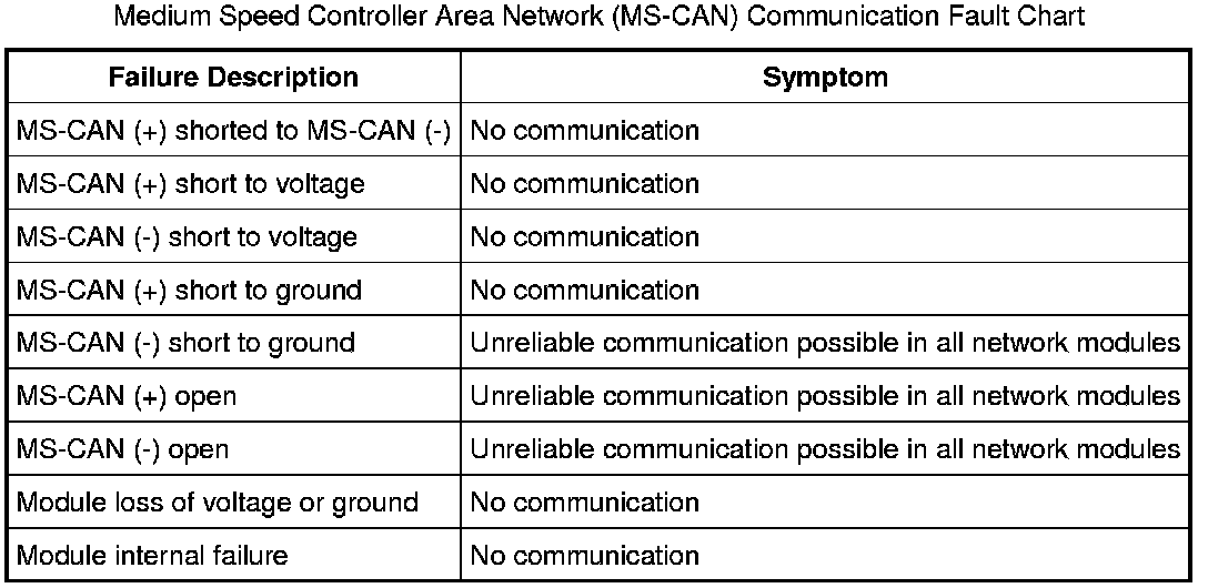 The following fault chart describes the specific MS-CAN failures and their resulting symptom:
