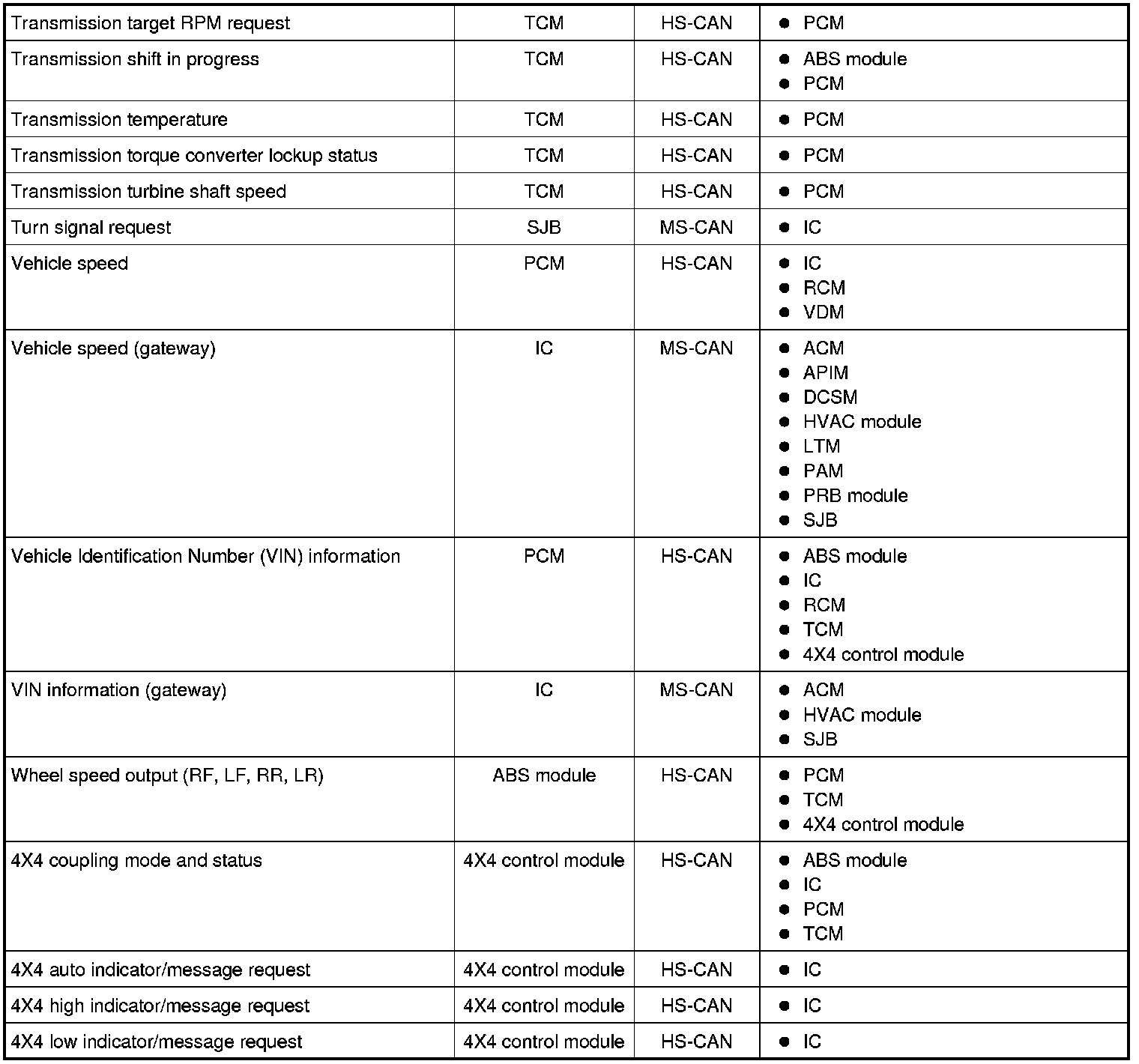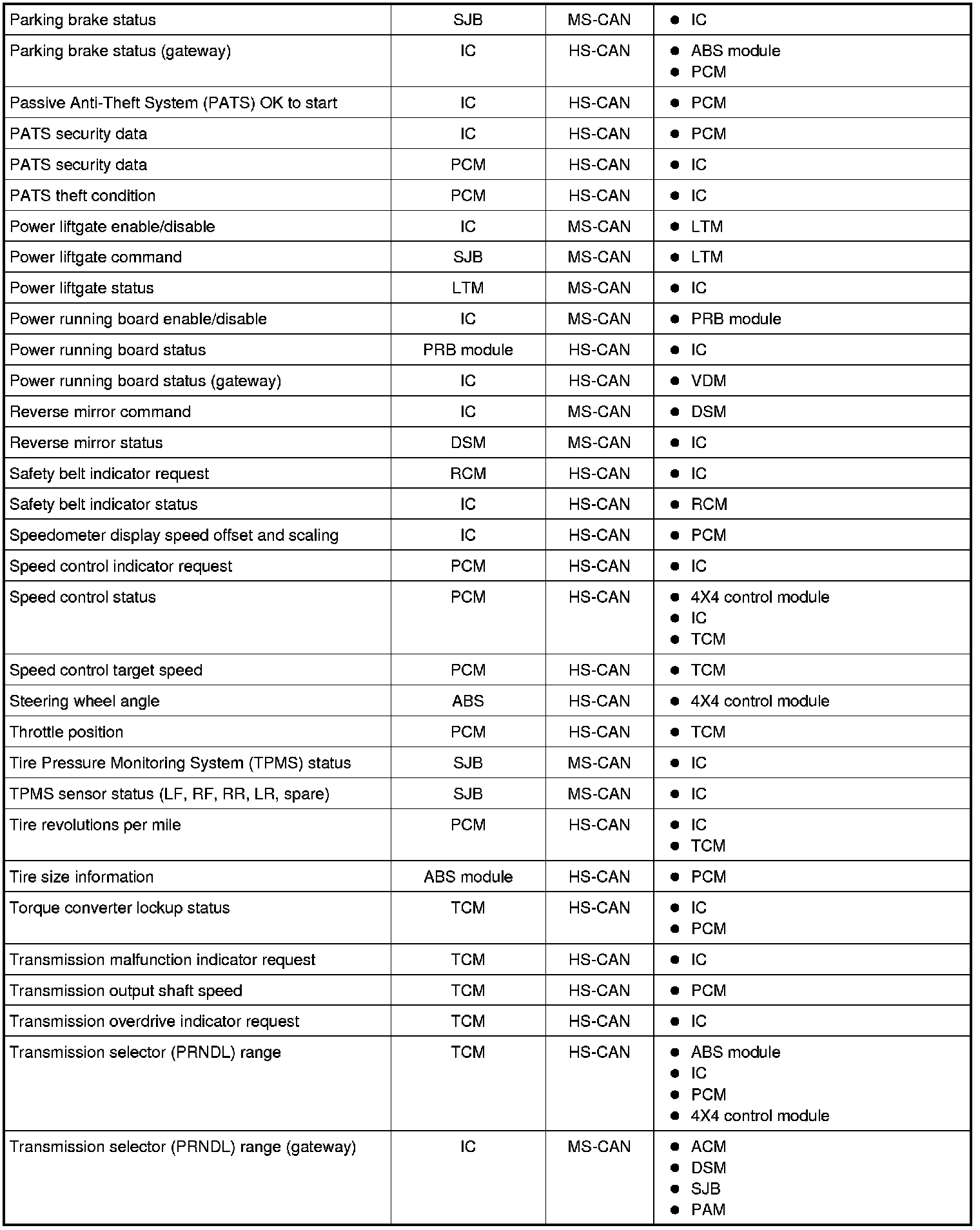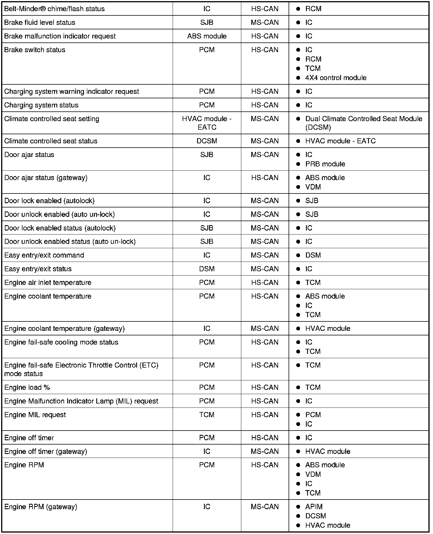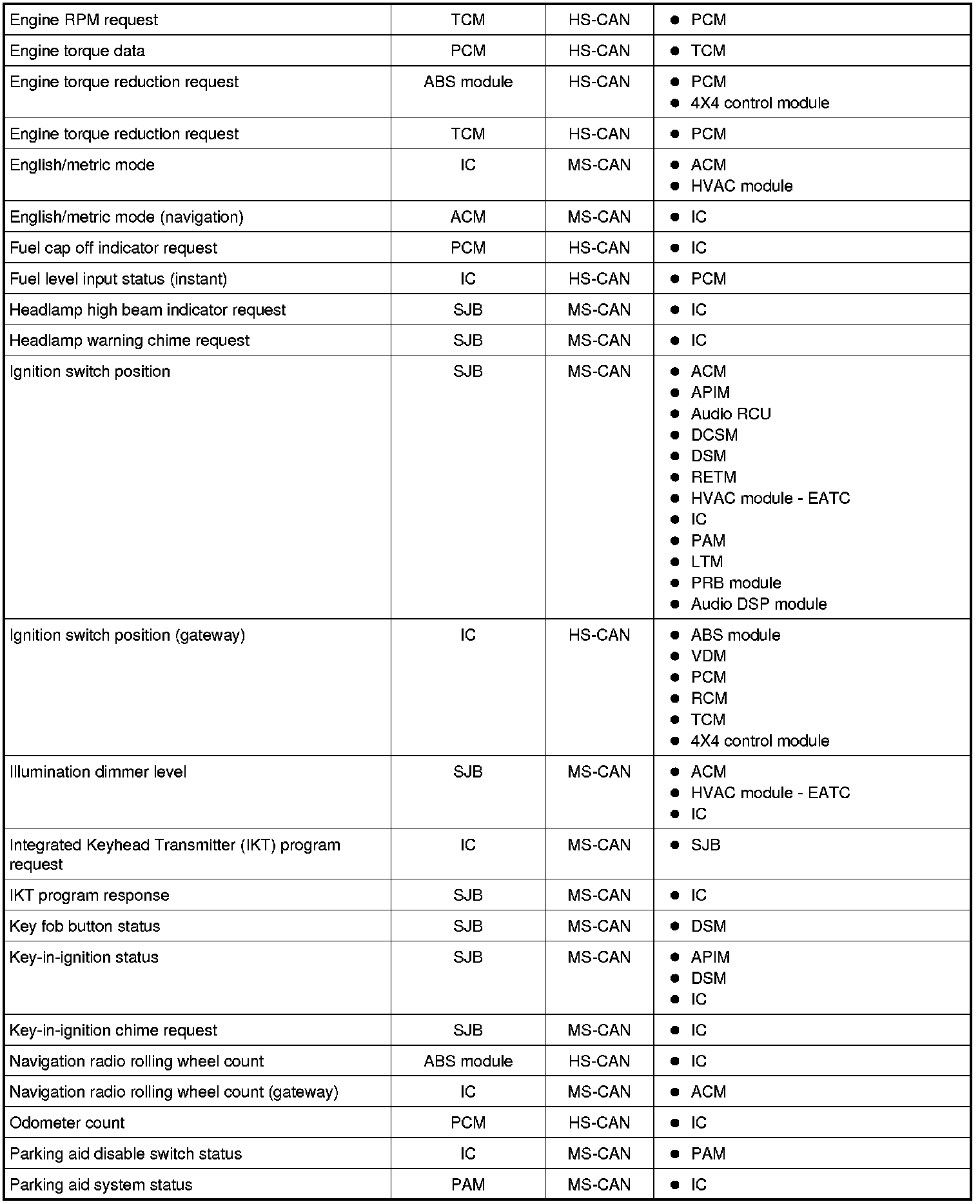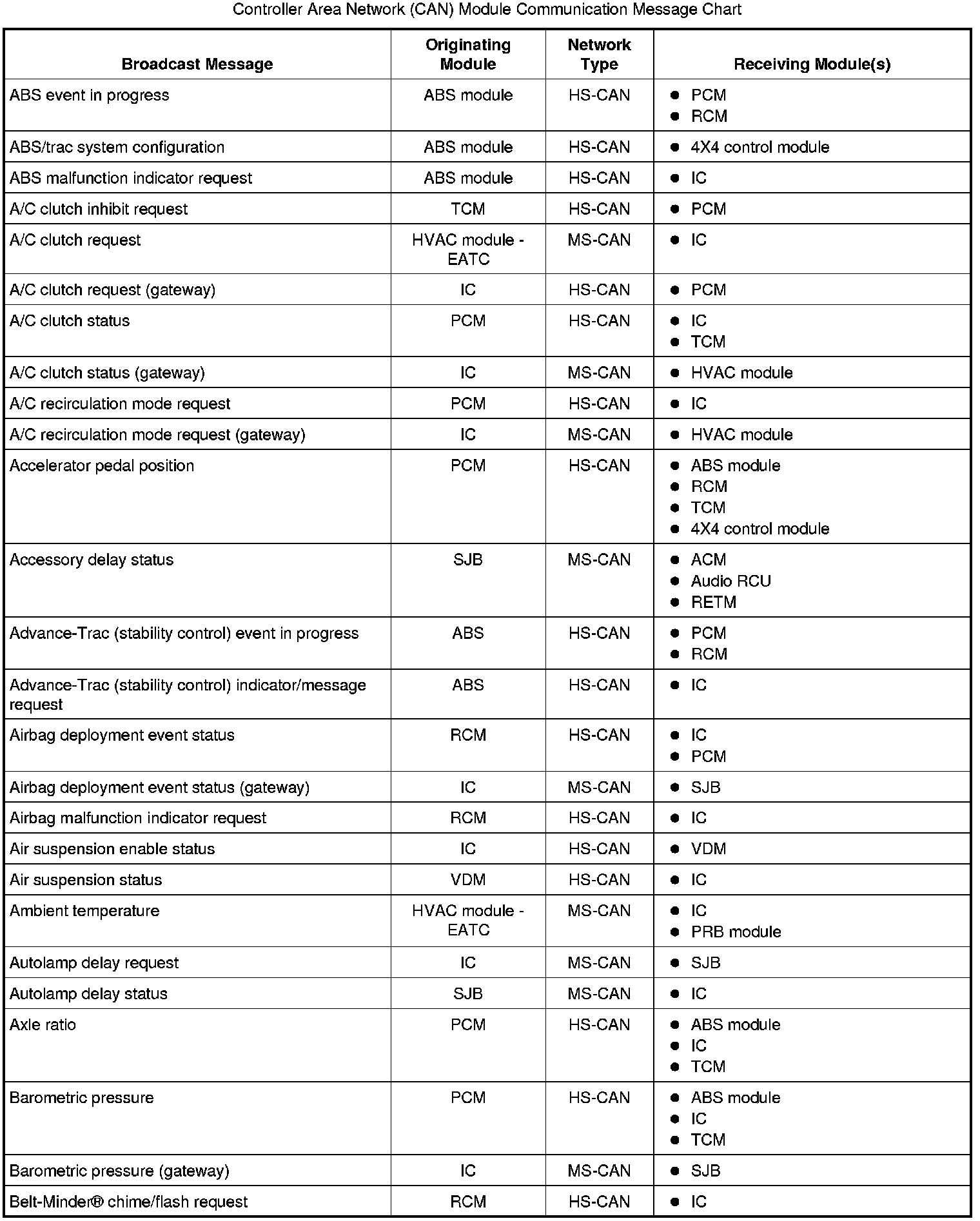 The following chart describes the specific CAN messages broadcast by each module, and the module(s) that receive the message: