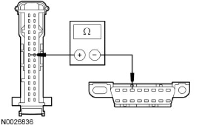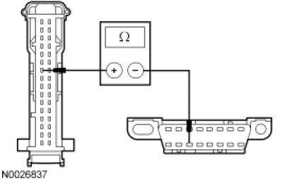 - Measure the resistance between the RETM C949-7, circuit VDB07 (VT/OG), harness side and the DLC C251-11, circuit VDB07 (VT/OG), harness side.
