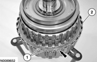 Install a new direct clutch outer shell retaining ring with the snap ring gap positioned approximately 120 degrees from the index mark made on the forward clutch hub during disassembly.