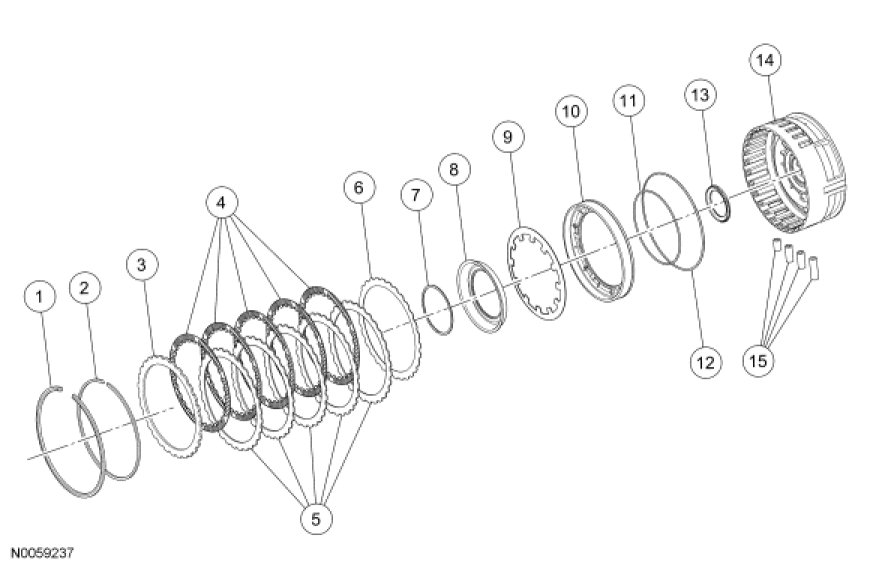 7. Install the new intermediate clutch plates, starting with the wave spring then a steel plate and alternating between friction and steel plates, and ending with the pressure plate.