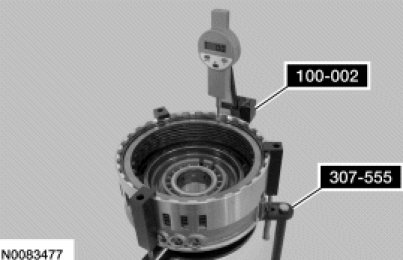 Install the intermediate clutch assembly into the Clutch End Play Gauge 307-555 and install the Dial Indicator Gauge with Holding Fixture 100-002 and position the plunger so it fits into the opening of the snap ring.