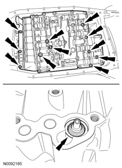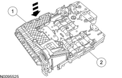 10. NOTICE: During removal of the mechatronic assembly, the thermal bypass valve will fall out of the transmission case. Damage to the valve will occur if the valve falls out.