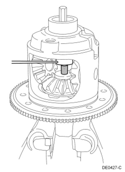 Insert a suitable dowel bar in the hole of the nut. Tighten the forcing screw to force the differential side gear away from the differential pinion gears.