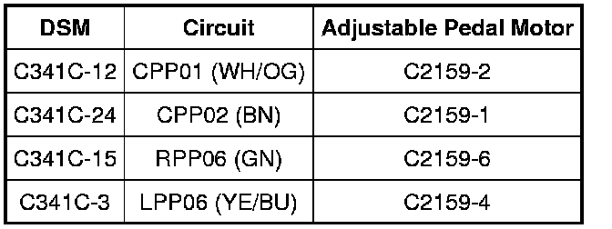 - Measure the resistance between DSM C341C, harness side and adjustable pedal motor C2159, harness side as indicated in the following chart: