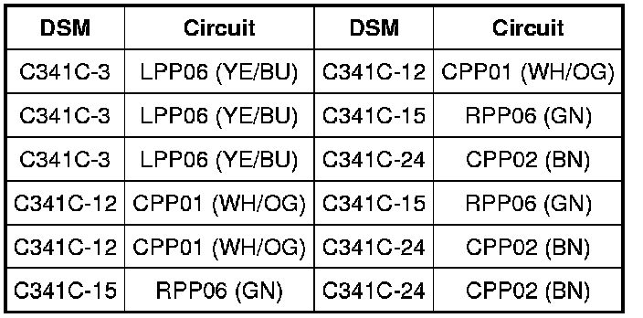 - DSM C341C-12, circuit CPP01 (WH/OG), harness side.