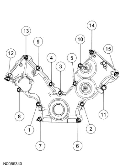 Tighten the 15 engine front cover fasteners in the sequence shown in 2 stages.