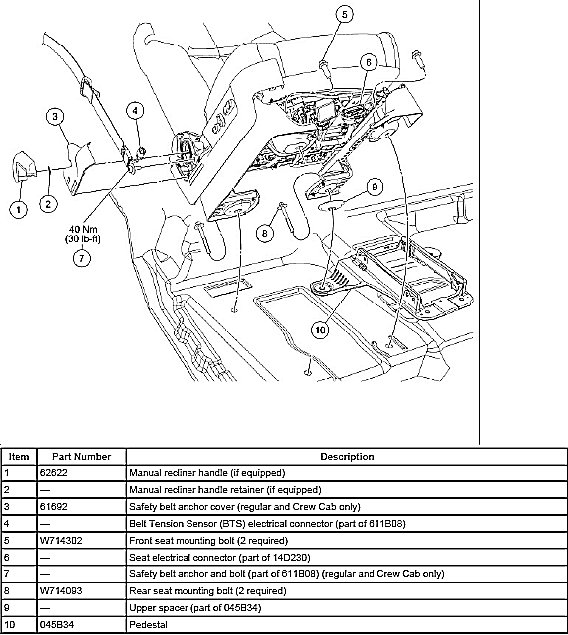 NOTICE: The pedestal used for front center seat and floor console mounting contains press fit washers and spacers designed to prevent corrosion at the front seat and floor console mounting areas. Do not remove these parts from the pedestal during service and make sure they are correctly positioned before installation. Failure to follow these instructions may result in severe corrosion damage to mounting areas and fasteners.