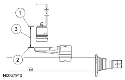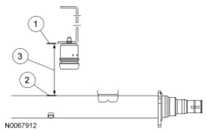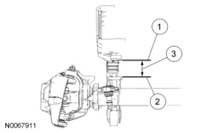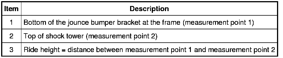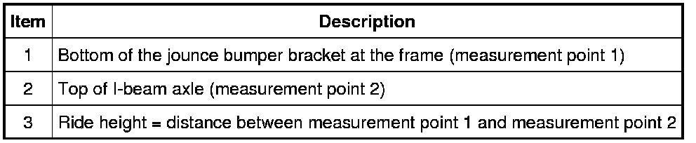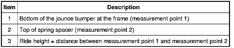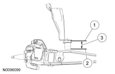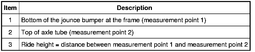 To obtain vehicle ride height, measure the distance between points 1 and 2. For additional information, refer to Specifications.