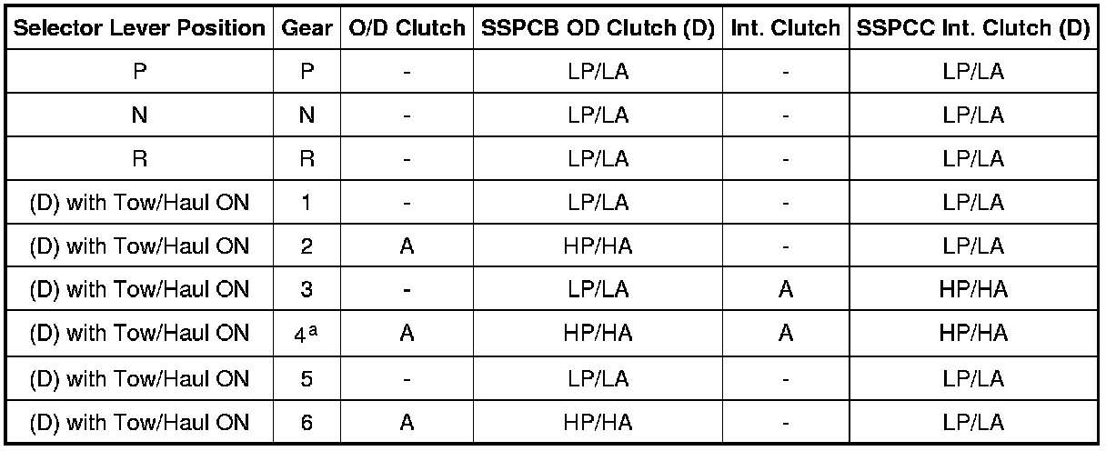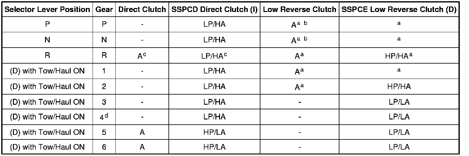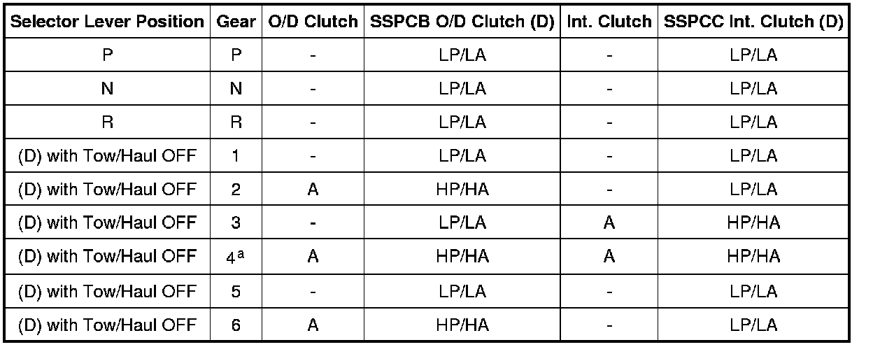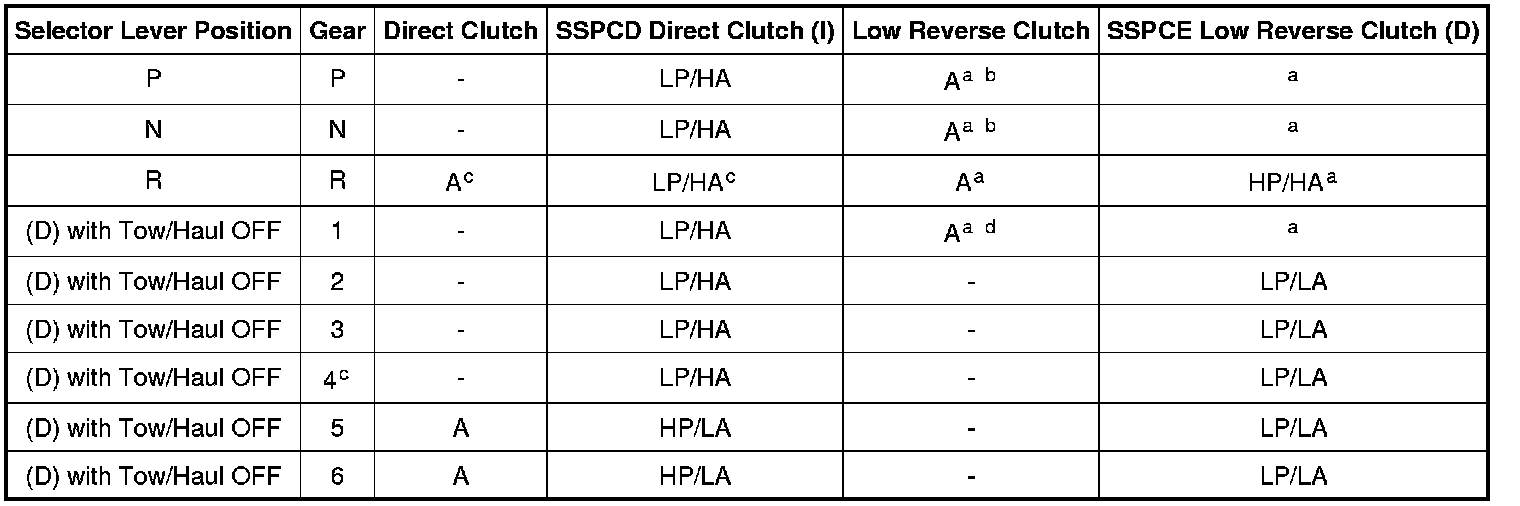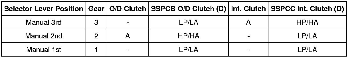 (b) = SSPCD commanded pressure as viewed on diagnostic equipment will be zero. The manual valve controls pressure to the direct clutch in the R detent position. To confirm the presence of the direct clutch pressure monitor the pressure switch PS-D, PS-D should be open in the R position.
